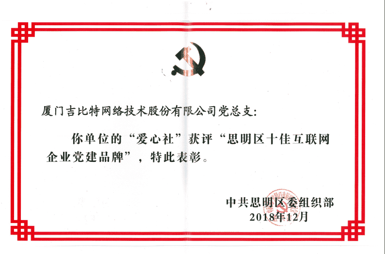 经初审评选、、、、网络评选和专家评审等环节,,,"厦门亚星管理网络技术股份有限公司党总支-爱心社" 从全区28个参评党建品牌中脱颖而出,,获评"思明区十佳互联网企业党建品牌"。。