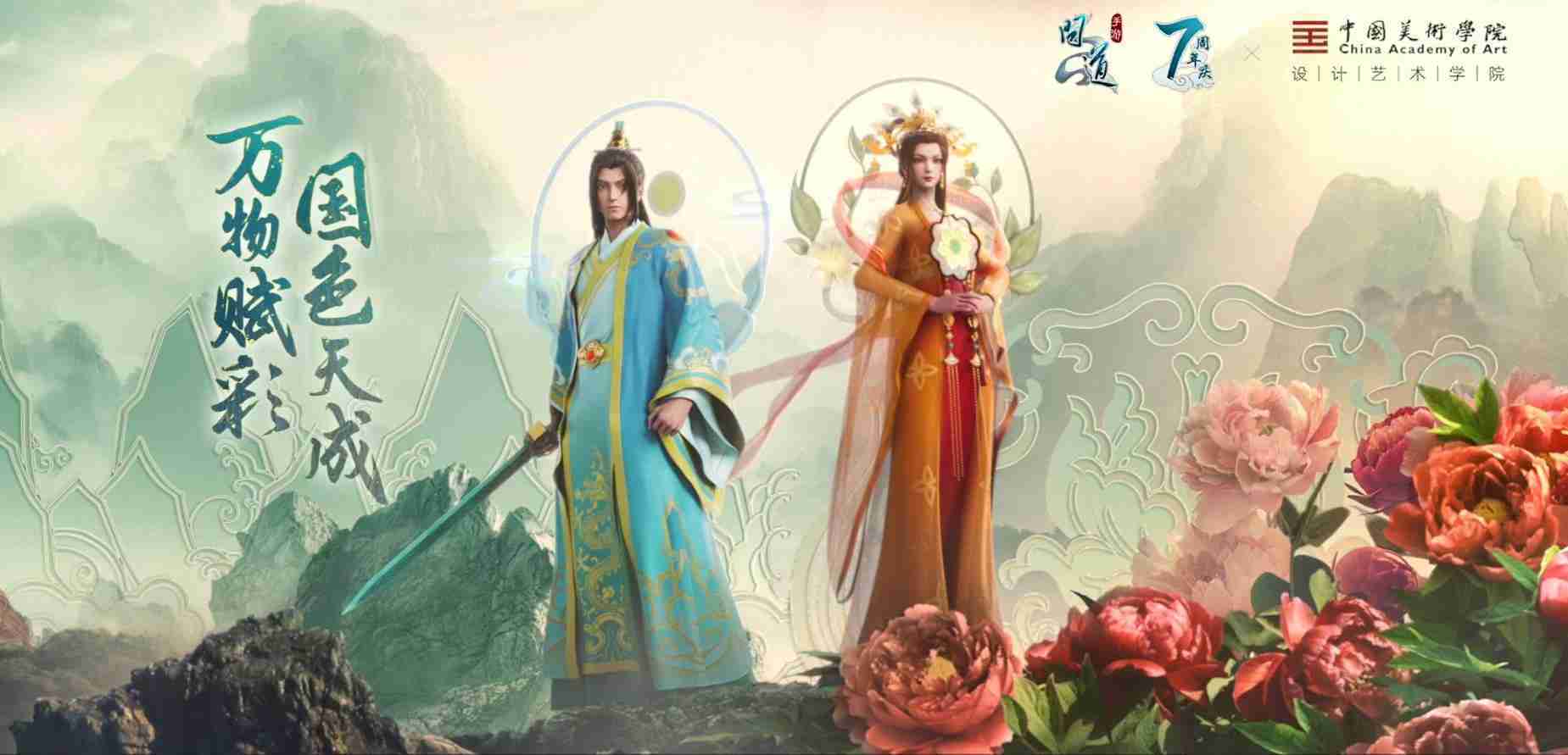 2023年4月,,,《问道手游》联动中国美术学院,,,,在游戏中融合了中国历史上不同时期的文化元素,,打造了“山河万象”与“凤鸣九霄”的国风时装。。。。在色彩配置方面,,创作团队基于对游戏角色特性的分析提取相应的文化内涵,,,,从每一种色彩的色相、、、指代事物和情感出发对应角色属性,,,选定服装的色彩搭配。。在纹样设计方面,,创作团队结合游戏角色自身特殊的造型比例和形态,,,,在实际的纹样设计中进行了游戏语境下的活化演绎。。。男性角色集中使用了如蟒纹、、、、海水江崖纹、、、如意纹和云气纹等传统纹样元素,,,女性角色则吸纳了凤凰纹、、、牡丹纹、、卷草缠枝纹等元素,,,组成以“双凤牡丹纹样”“缠枝牡丹纹”“金玉凤冠头饰”为主要纹样的游戏角色装饰图案系统。。