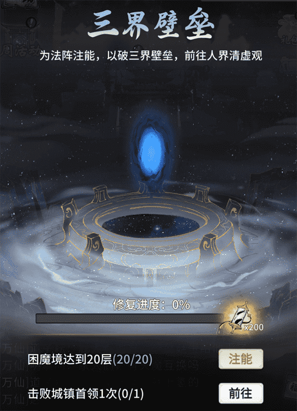 当你修为达到返虚/破虚中期后,,,可在城镇寻得芸丫并激活神秘法阵,,,通过收集材料、、、击败首领等方式为法阵注能,,借以打破三界壁垒,,,,开启支线剧情“清虚旧梦”