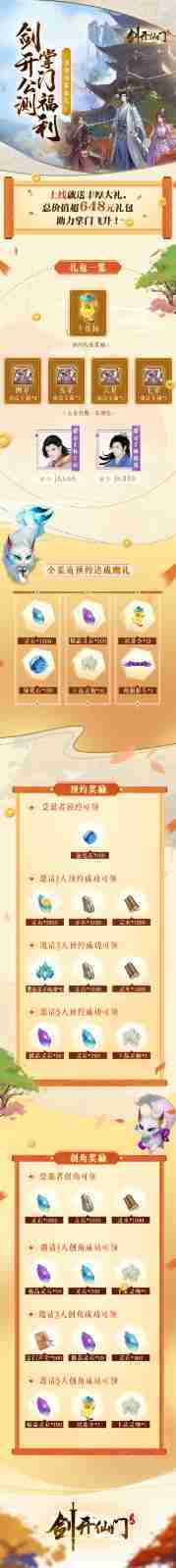 游戏为大家准备了海量的福利,,,,包括上线即可获得的全渠道预约礼包、、、、十连抽等福利,,输入密令“JK666”、、、、“JK888”即可领取紫色弟子,,达到金丹期后还有功法宝箱可领,,助力全宗上下实力提升……所有奖励总价值超过648元,,而邀请好友一起体验,,,,更可以获得额外的奖励哦~