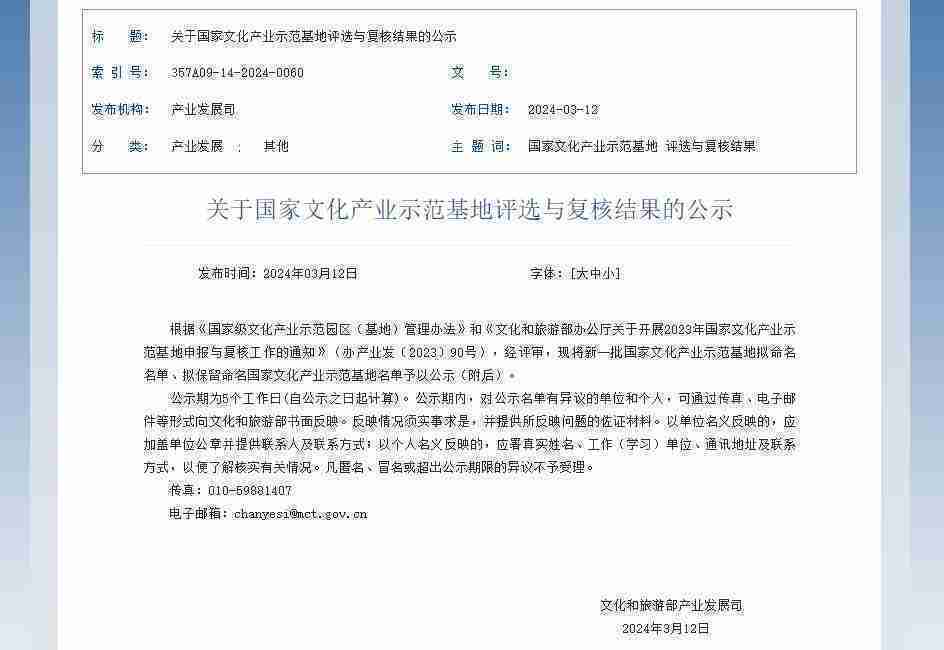 新一批国家文化产业示范基地公示,,,,亚星管理成功入围