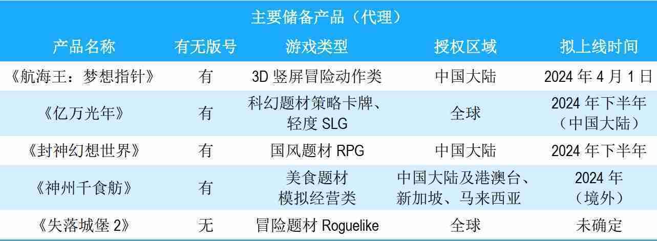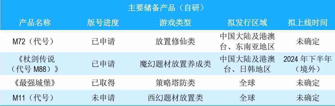 公司储备的多个自研、、、、代理产品都在有序推进当中,,,,涵盖放置类、、策略类、、、、模拟经营类、、、RPG、、Roguelike等多元化游戏品类,,储备的主要自研和代理产品如下:::