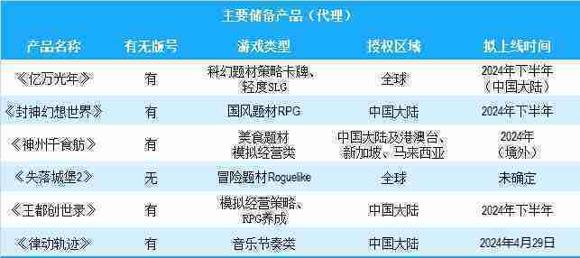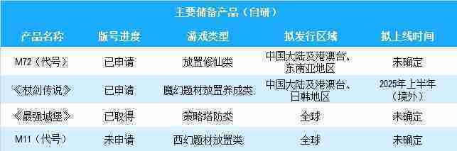 公司有多款储备产品,,,涵盖放置类、、、、策略类、、、、RPG、、、、Roguelike等多元化游戏品类,,储备的主要自研和代理产品如下:::
