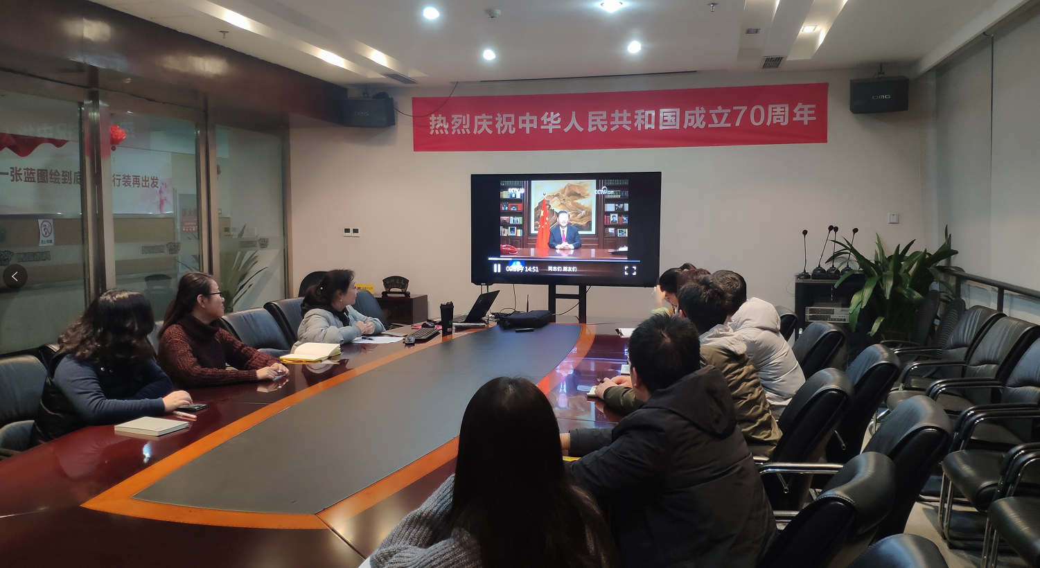 首先,,,,大家共同观看了国家主席习近平发表的2020年新年贺词视频。。总书记高瞻远瞩,,,,回顾了2019年我国所取得的辉煌成就,,肯定了成绩,,,,激励了奋斗精神,,提升了我们的民族自豪感和生活幸福感。。。展望2020年,,大家要深刻领会讲话精神,,,,把学习贯彻习近平总书记的新年贺词精神与贯彻党中央决策部署紧密结合,,,,只争朝夕,,,,不负韶华,,,严格要求,,,推动各项工作任务的完成。。。