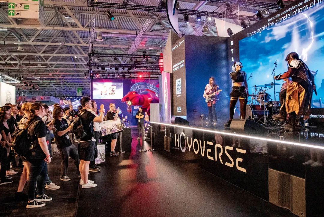 2023年8月23日,,,,德国科隆游戏展期间,,,人们在米哈游展台观看乐队表演游戏歌曲。。。图/新华